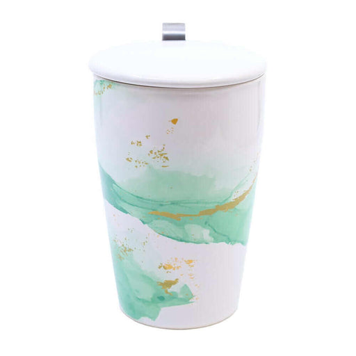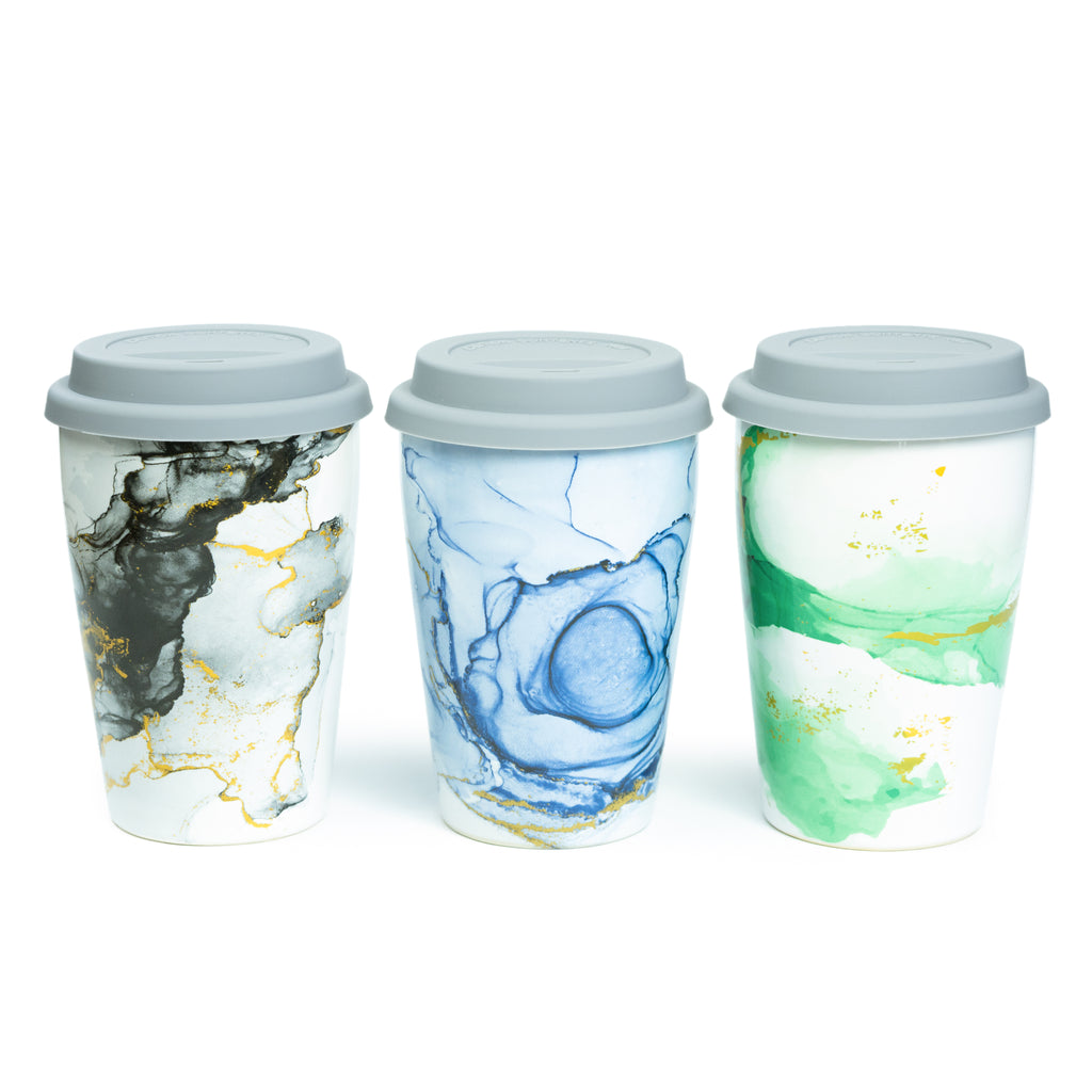 Grab a stylish 12oz Porcelain Travel Cup with abstract watercolor design in 3 colors - Graphite Black, Sapphire Blue and Jade Green! This travel cup is perfect to steep your tea with the stainless-steel tea infuser, snug porcelain lid to keep your tea nice and hot. Additional complementary silicone grey travel lid included to take your tea with you where-ever you are! Easy to enjoy at home or on the go! Dishwasher safe. Do not microwave.