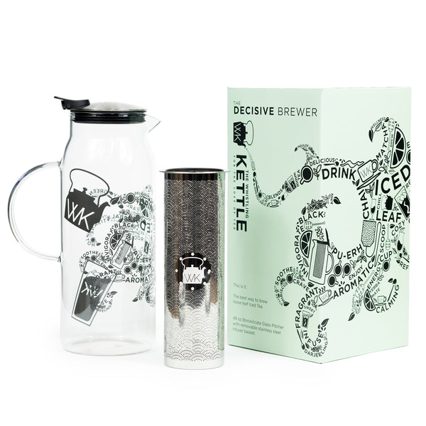 New for 2025 is the more assured Decisive Brewer. Like it's older cousin, the Conflicted Brewer, our new iced tea maker is perfectly suited for cold brewing or hot brewing and can be used with any type of tea. The Decisive Brewer includes a handy refrigerator magnet with a guide on how to use it to prepare each style of tea, and since we make it from borosilicate glass it'll be fine going from hot to cold or vice versa. It holds 48 fluid ounces and includes a stainless-steel infuser. The lid is removable for easy cleaning. The pitcher body is 3 7/8" in diameter and 9 3/4" tall. Including the handle, the pitcher is just over 6" wide.
